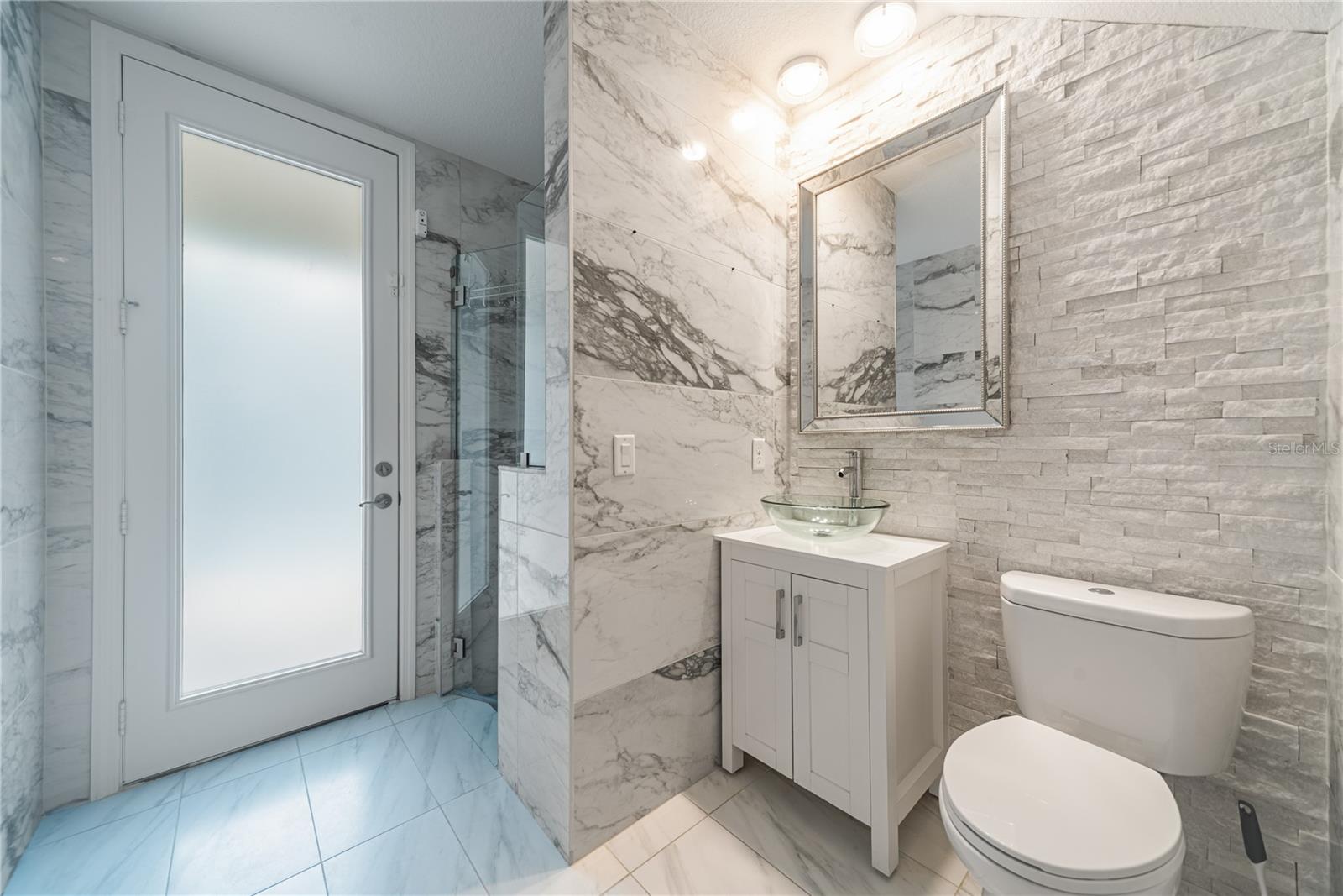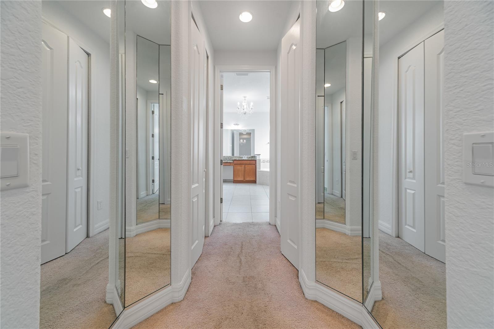 Sliding glass doors connect the main living areas to the screened pool and outdoor entertaining space, offering privacy and views of the surrounding trees and golf course. The primary suite includes a designer-style walk-in closet and an en-suite bathroom with dual vanities, a glass-enclosed walk-in shower, and a private water closet.