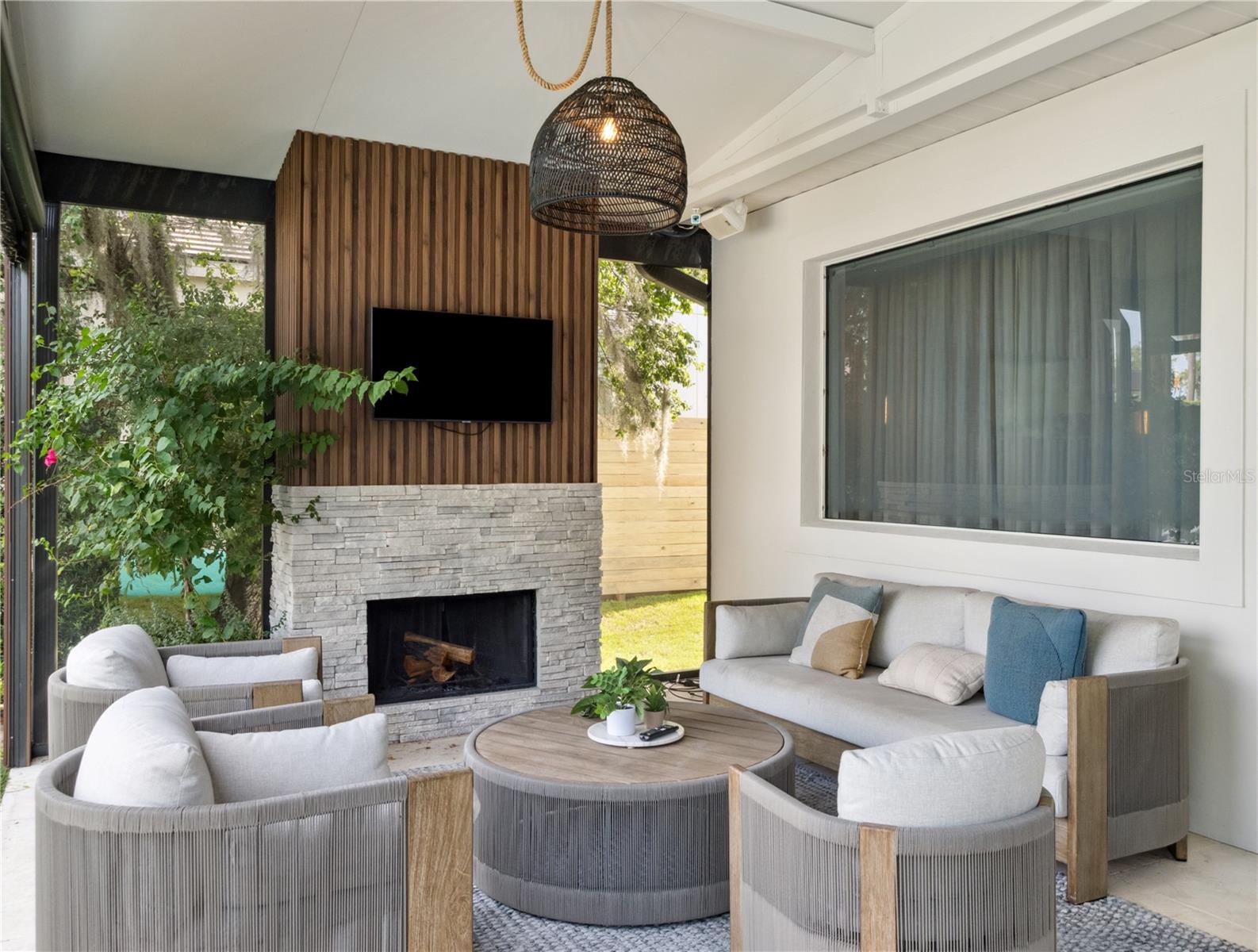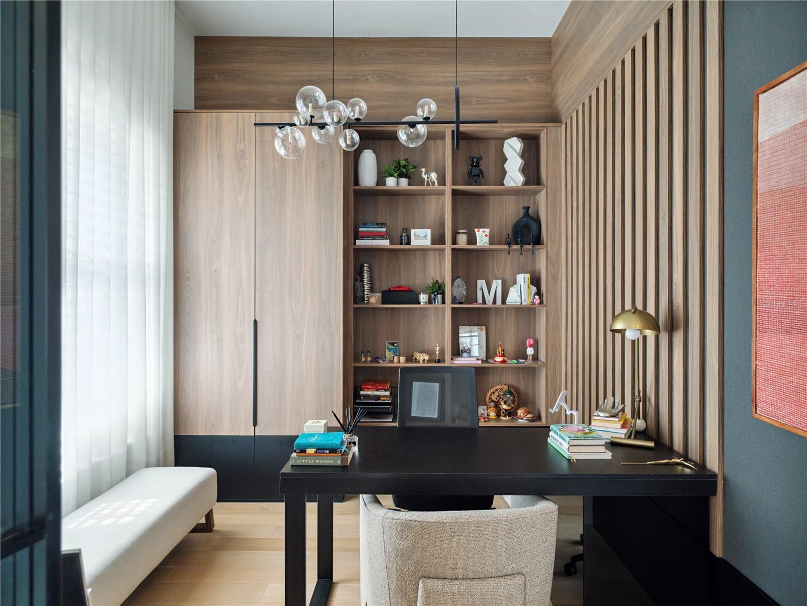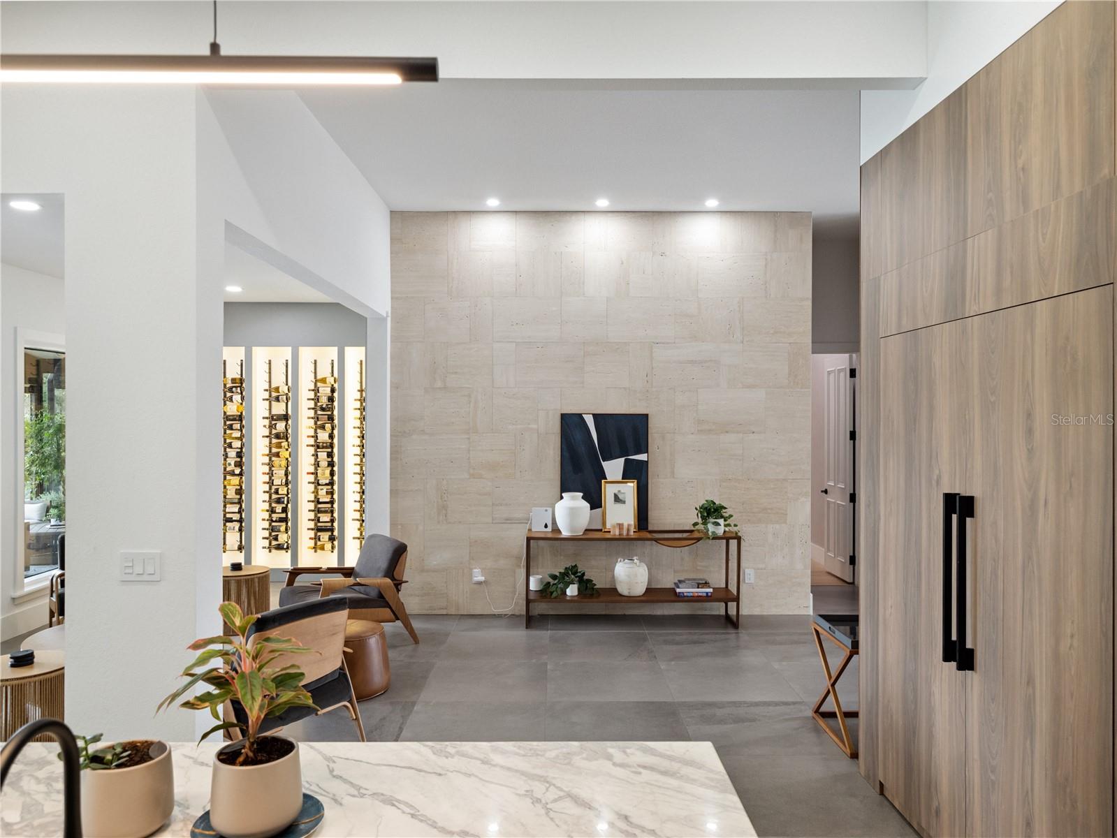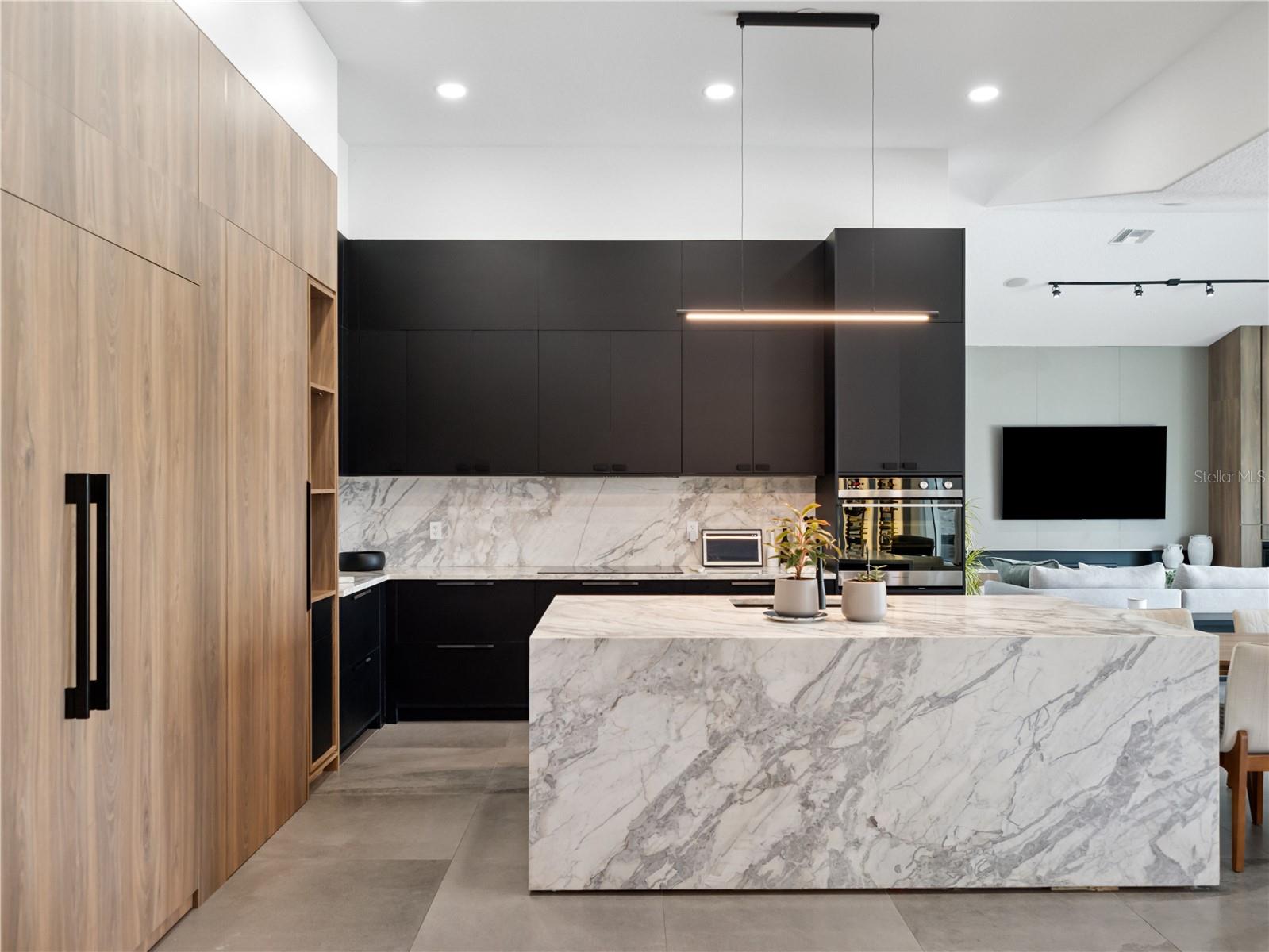 Step inside to an inviting open-concept floor plan featuring a stylish living area with custom built-ins, sleek wood accents, and large windows that flood the space with natural light. The gourmet kitchen impresses with high-end cabinetry, integrated appliances, and a striking waterfall-edge island -- ideal for both entertaining and everyday living.